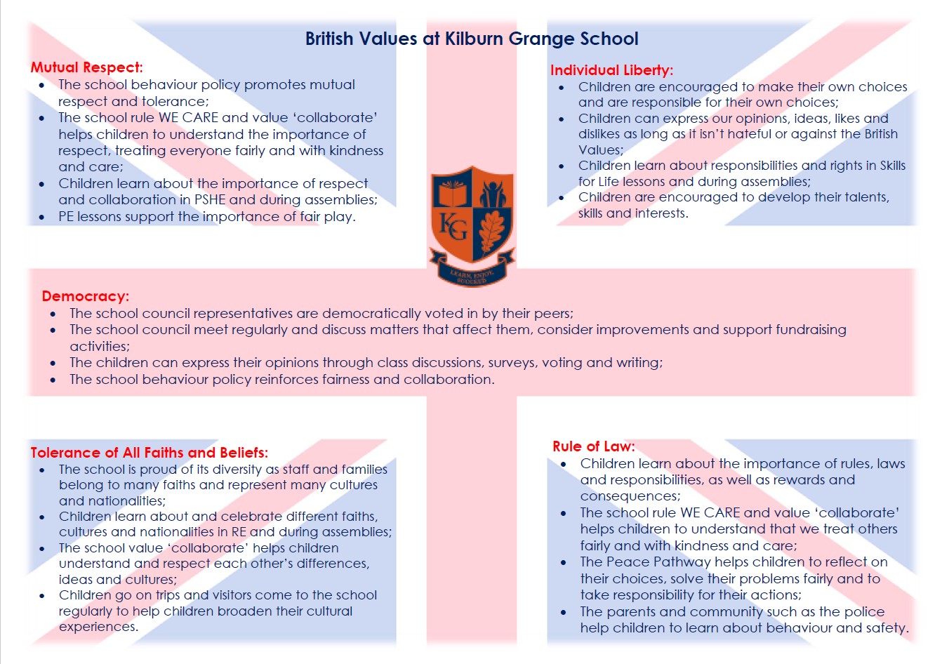 At Kilburn Grange School, we recognise the importance of preparing children for life in modern Britain and promoting values that are an integral part of 21st century British society. The core British values are: