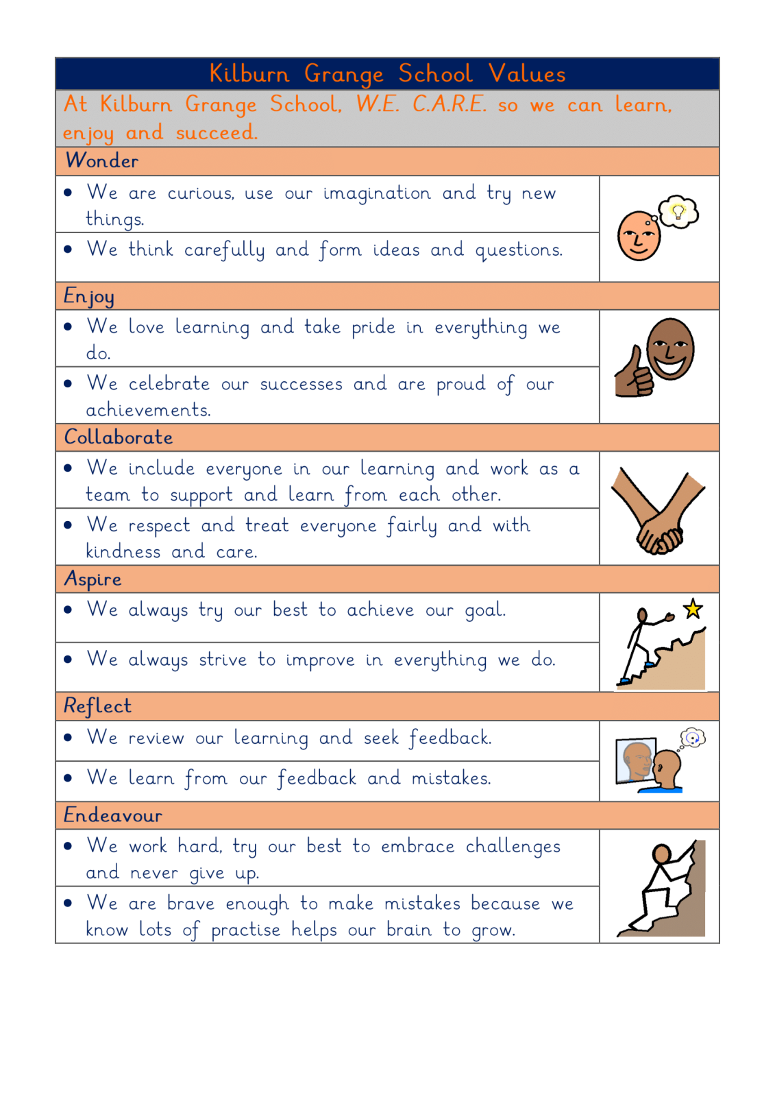All our teaching and learning is underpinned by our core values that show W.E. C.A.R.E. for ourselves, each other, our community and beyond.