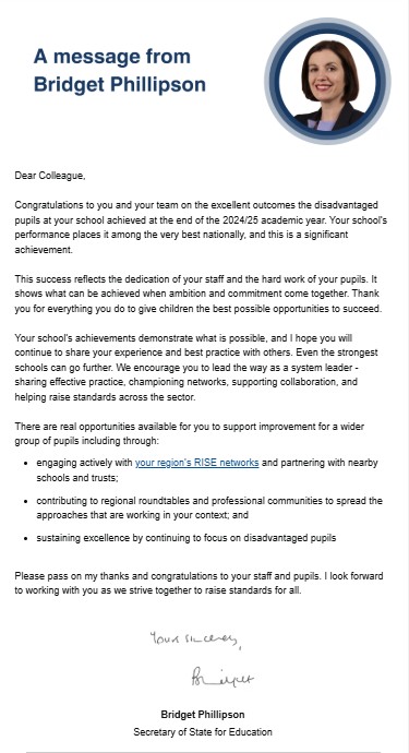 Kilburn Grange School received a letter of congratulations from Bridget Phillipson, Secretary of State for Education, recognising our exceptional outcomes for disadvantaged pupils in the 2024/25 academic year.
